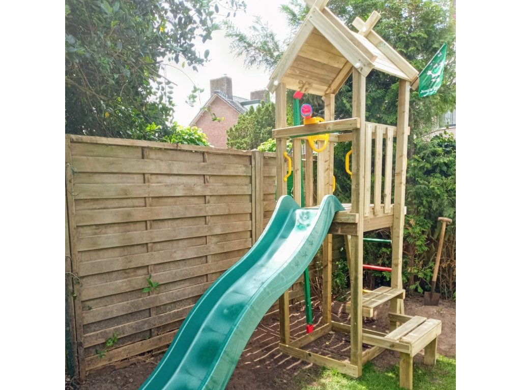 Skluzavka není součástí dodávky, můžete si ji doobjednat v souvisejících produktech. Na hřiště se připojuje skluzavka o délce 2,2 m a její nástupní výška je 125 cm.