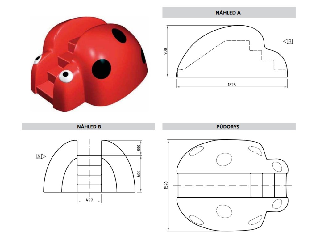 Kvalitní laminátová skluzavka ve tvaru berušky vhodná pro veřejná dětská hřiště, plavecké zařízení, MŠ, kempy, restaurace a další. Pevný a odolný materiál zaručuje dlouhou životnost i při intenzivním používání. Díky promyšlenému tvaru je skluzavka bezpečná pro menší děti, má pohodlný nástup a plynulý dojezd.