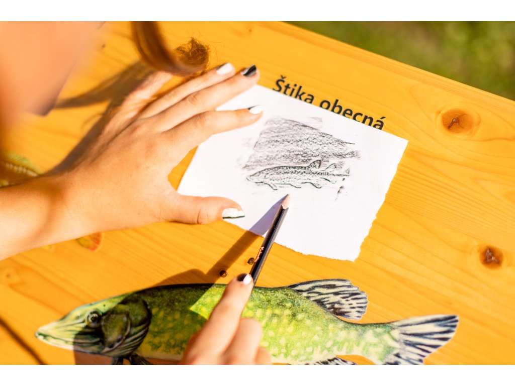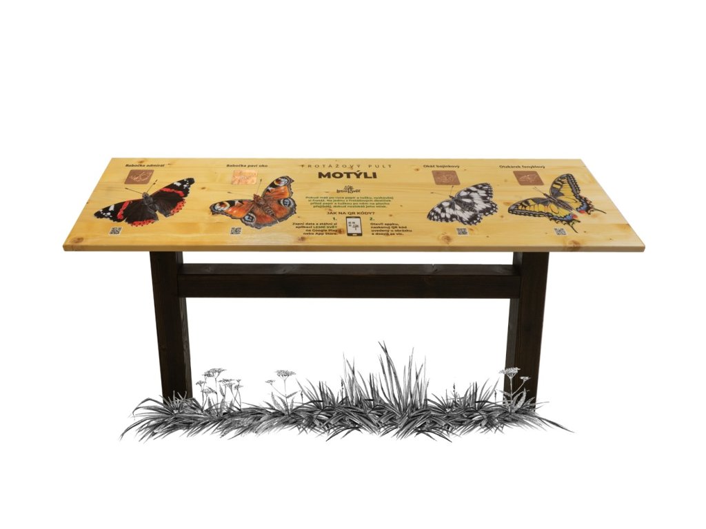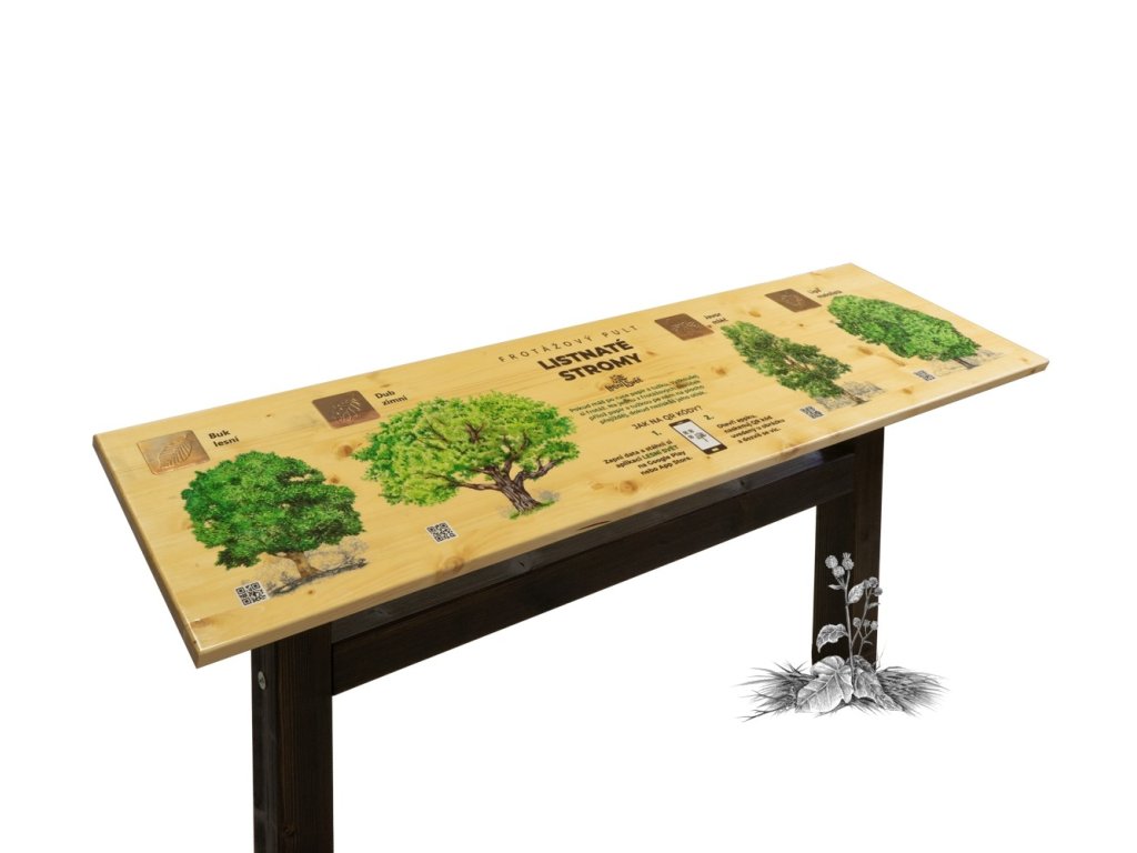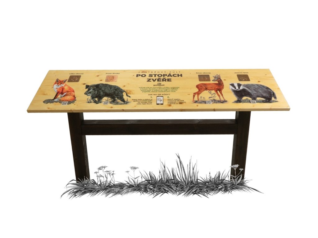 Edukační panel ve tvaru pultu propojuje poznávání přírody s tvořivou i digitální zábavou. Frotážový pult obsahuje 4 reliéfní frotáže, autorské ilustrace a QR kódy s doplňujícími informacemi. Témata jednotlivých pultů zahrnují: dřeviny (listy a plody), zvěř, stopy zvěře, domácí zvířata a hmyz.