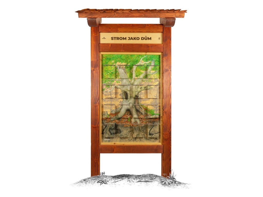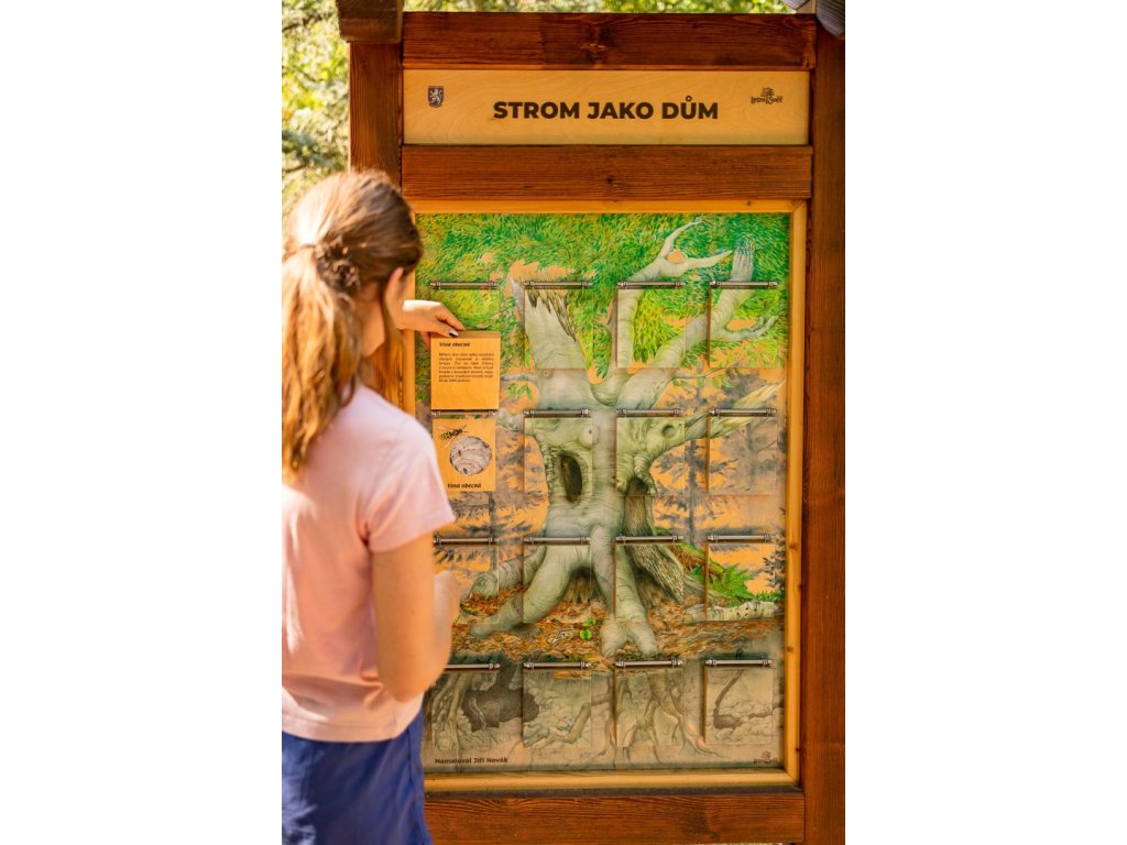 Edukační panel Strom jako dům přibližuje život v různých stromových patrech, která jsou domovem řady živočichů a rostlin. Tento panel se věnuje buku a ukazuje, jak strom slouží jako útočiště a domov lesní fauny.