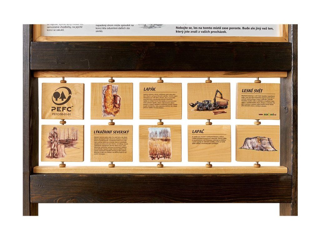 Součástí panelu je 10 otočných tabulek o velikosti 15 x 13 cm, pod kterými se skrývají ilustrace a zajímavé informace ze života kůrovce i z praxe ochrany lesa.