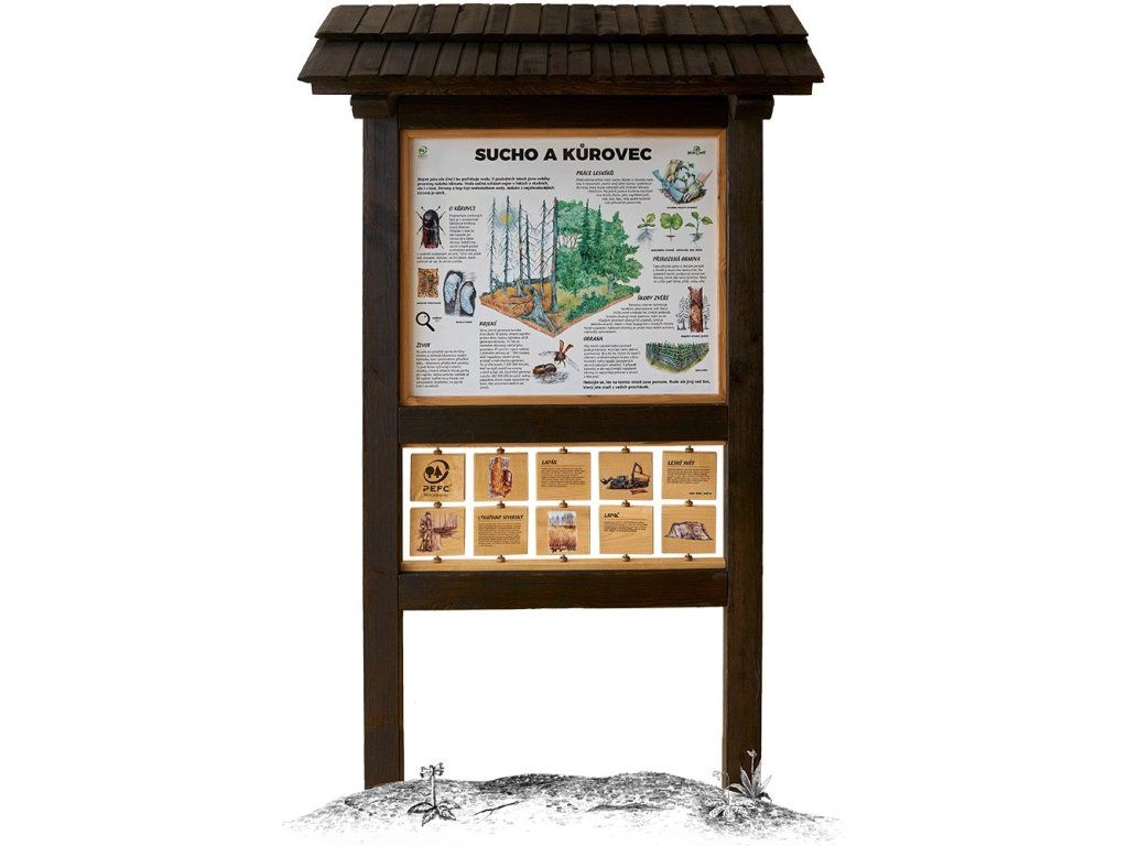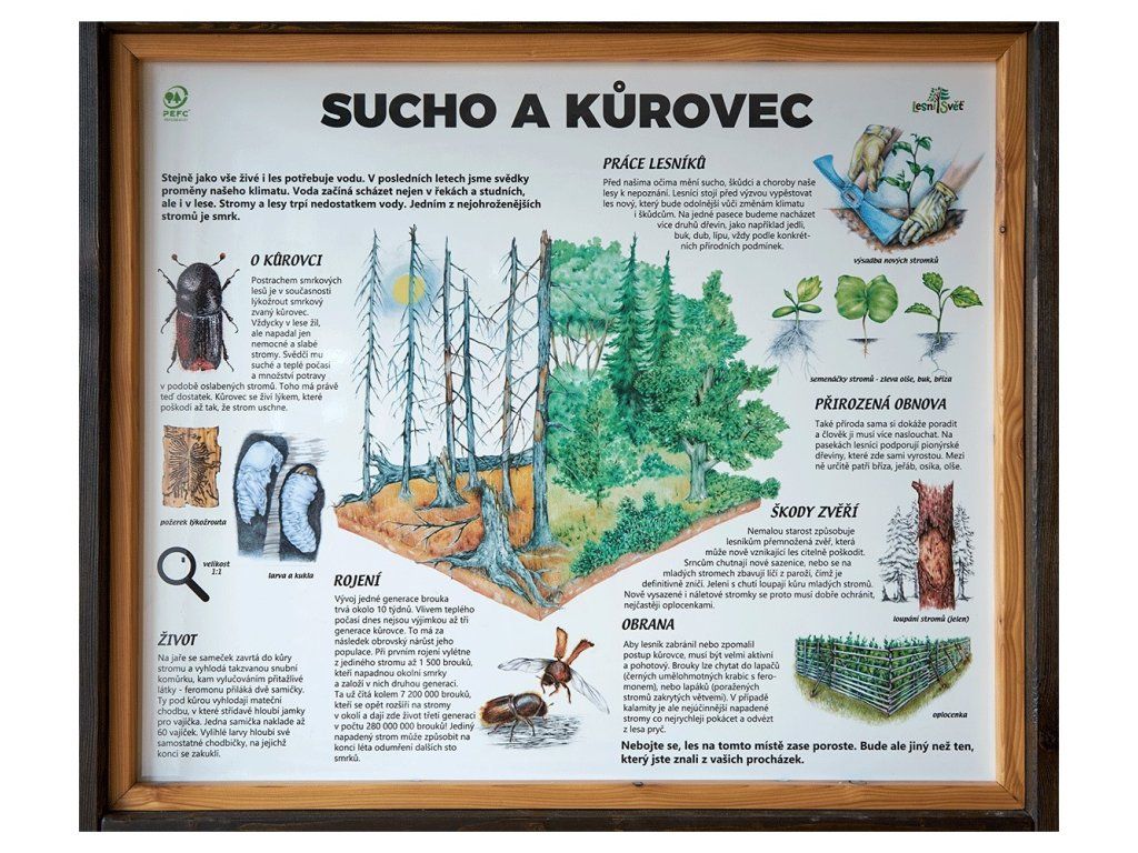Seznamte návštěvníky s životem kůrovce a jeho dopady na les prostřednictvím edukačního panelu s otočnými dřevěnými destičkami. Návštěvníci se dozvědí jaké škody kůrovec způsobuje a jak lesníci s podkorními škůdci bojují.