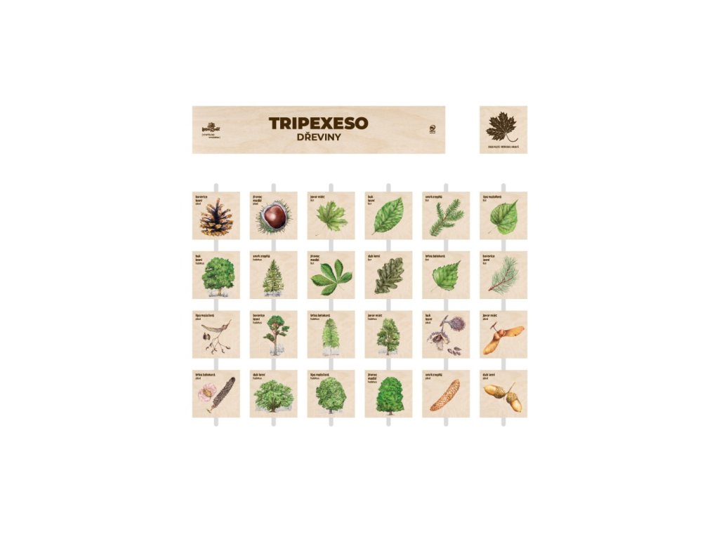 Na tabuli najdete 24 otočných tabulek o velikosti 10 x 10 cm. Na výběr jsou dvě varianty motivů. U varianty STROMY hledáte trojici habitus, list a plod. U varianty LESNÍ ZVĚŘ hledáte samce, samici a mládě.