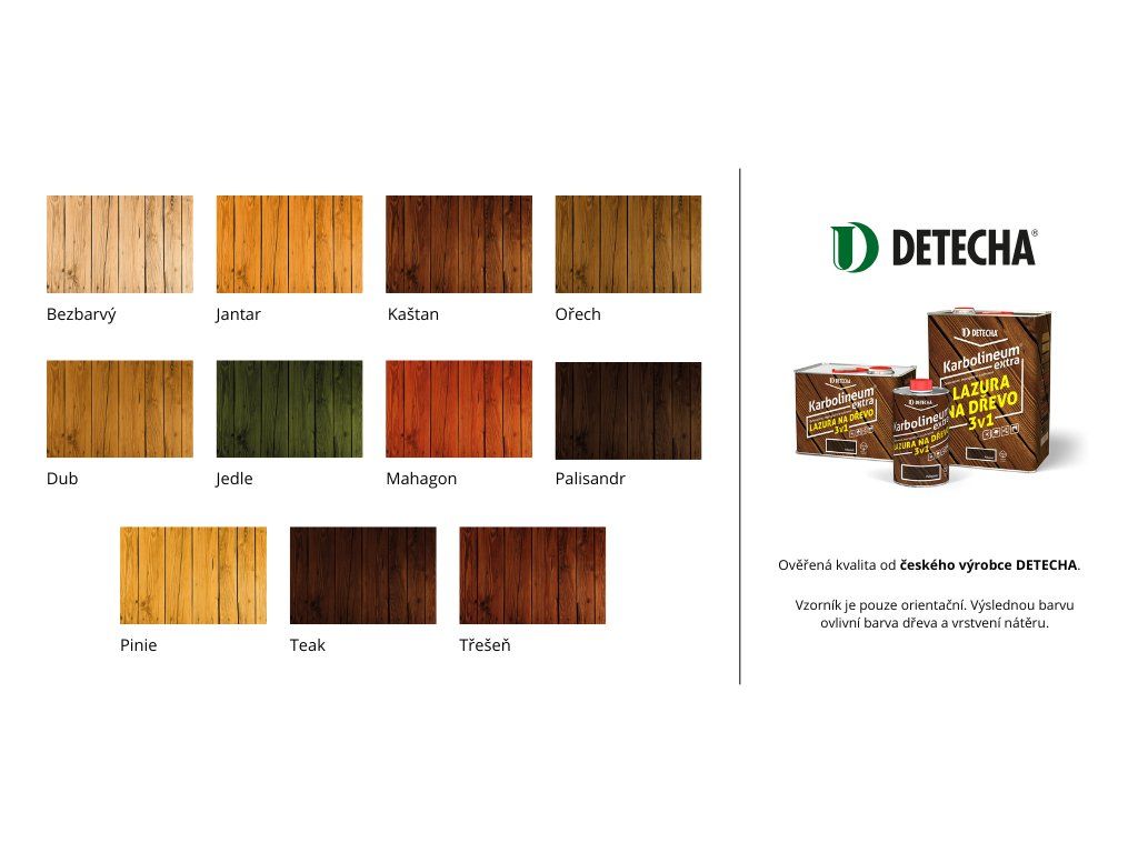 Základní varianty nátěru jsou odstíny kaštan, dub nebo palisandr, případně je možné zvolit jiný odstín dle přání. Kompletní vzorník naleznete ve fotogalerii produktu. Vybraný odstín nám napište k objednávce.