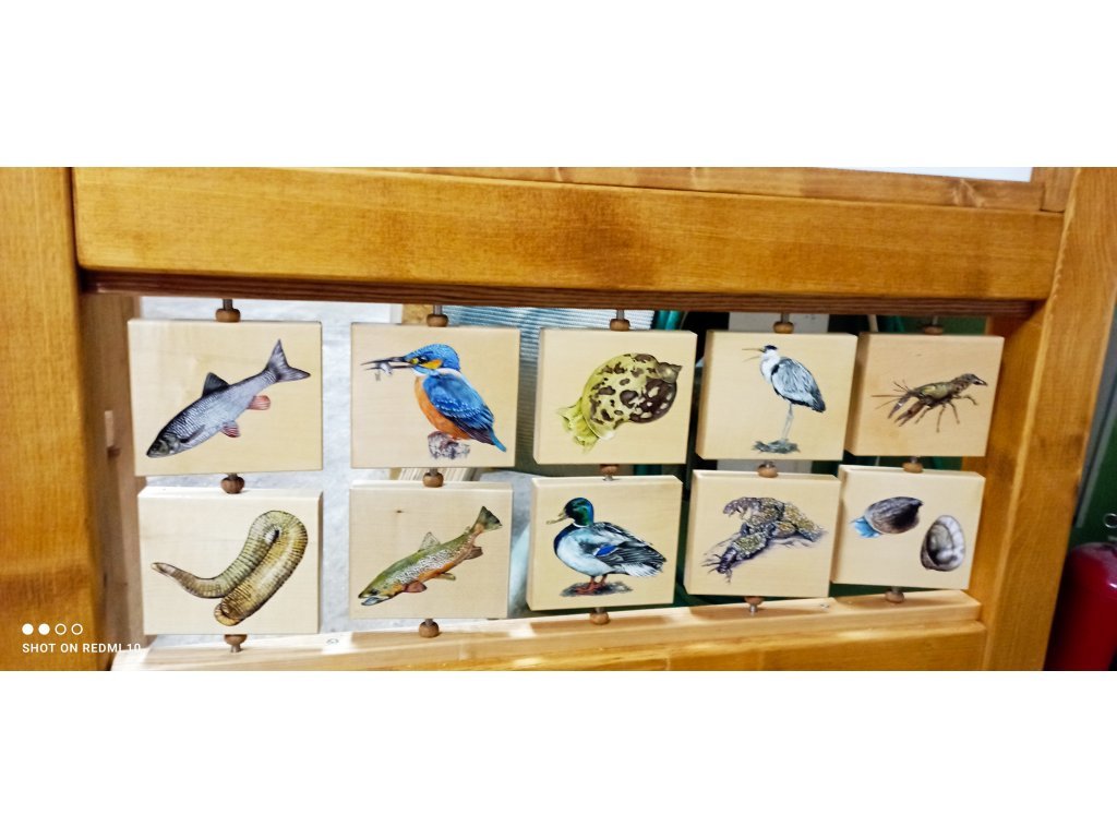 Edukační panely s biotopy přibližují typické prostředí jednotlivých ekosystémů i jejich obyvatele. Tento panel je zaměřen na prostředí řeky.
