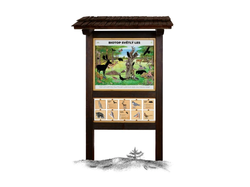 Edukační panely s biotopy přibližují typické prostředí jednotlivých ekosystémů i jejich obyvatele. Tento panel je zaměřen na prostředí světlého lesa.