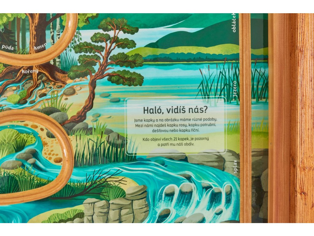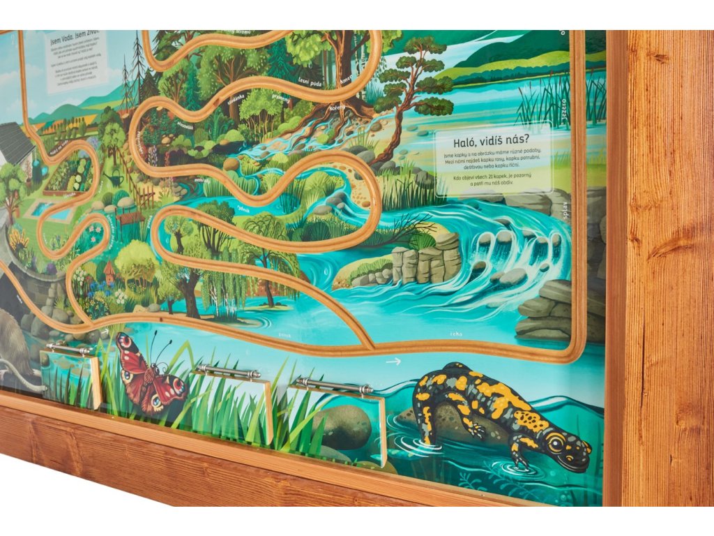 Panel představuje různé podoby kapky vody, se kterými se můžeme setkat – od dešťové přes říční až po kapku putující potrubím. Vydejte se na průzkum a zkuste najít všech 21 podob kapky ukrytých v ilustraci. Součástí prvku je také labyrint, který návštěvníky provede cestou kapky vody od dopadu na zem až po návrat zpět do oblak.