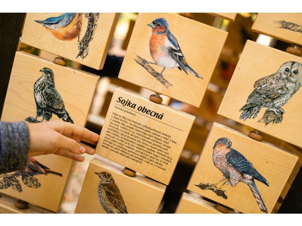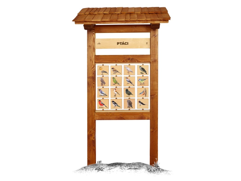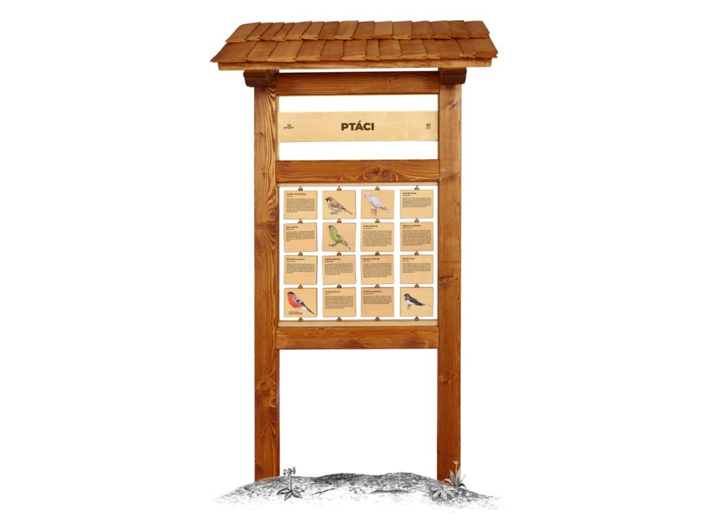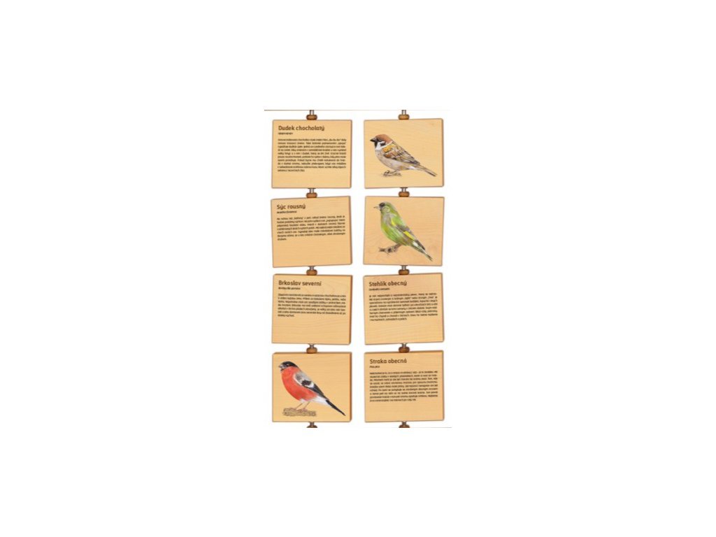 Součástí panelu je 16 otočných destiček o velikosti 15 x 13 cm. Na jedné straně najdete ilustrace ptáků, na druhé zajímavé informace, které přibližují jejich chování a život v přírodě. Návštěvníci tak mohou objevovat nové informace hravou formou.