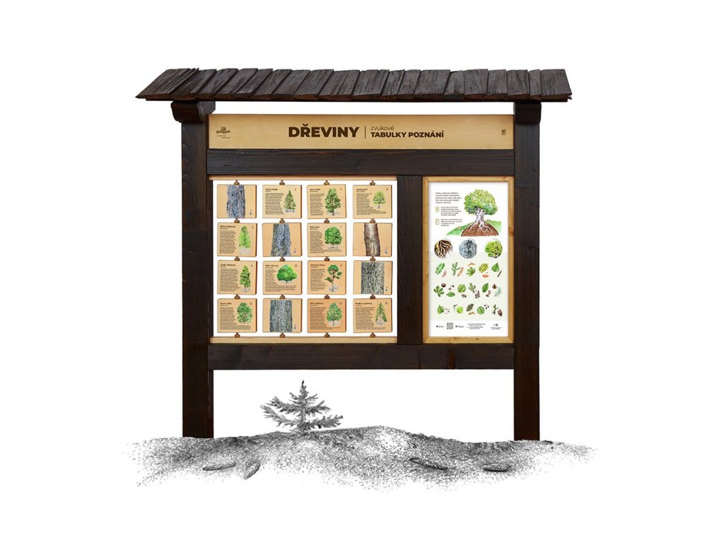 - Na jedné straně otočné tabulky je obrázek stromu a zajímavý text o dané dřevině. Na druhé straně je detail kůry stromu.