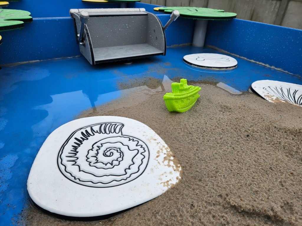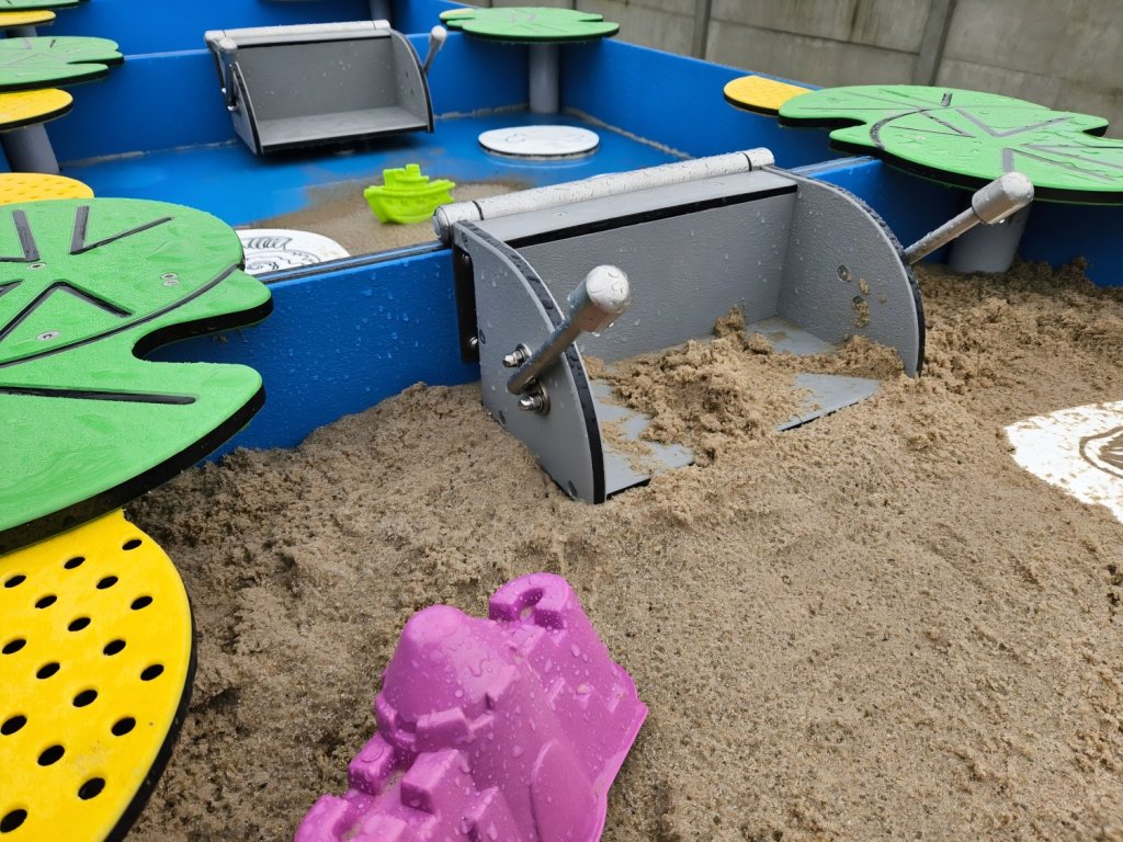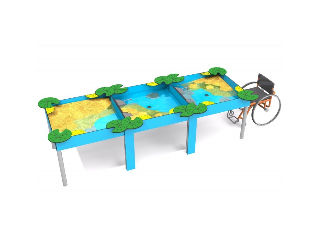 Inkluzivní trojité pískoviště pro kreativní hry s pískem a vodou, přizpůsobené dětem na invalidním vozíku. Pískoviště je vybaveno praktickými vrchními rohovými díly (listy) pro výrobu báboviček, zabudovaným sítkem a rukojetí pro přesypávání písku. Na dně pískoviště jsou umístěny prvky napodobující fosilie, například mušle nebo kosti. Vodní vývody uprostřed zařízení usnadňují čištění po hře.