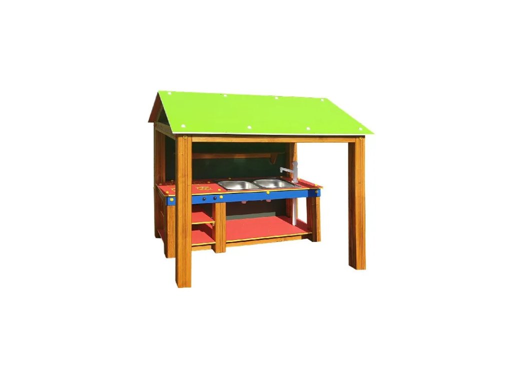 Venkovní kuchyňka ve variantě s přístřeškem vytváří hravý prostor pro rozvoj sociální interakce. Díky kuchyňským prvkům nabízí dětem zábavnou hru na vaření a podporuje jejich fantazii i přirozenou komunikaci.
