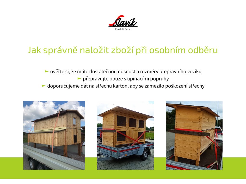 Doprava Slavík: zajištujeme sami po celé ČR . Cena dopravy je individuální dle vzdálenosti, bude oznámena po přijetí objednávky. Při skládání kurníku z přívěsného vozíku je vždy nutná asistence odběratele. Vykládka je do 1m od dodávky nebo přívěsného vozíku!!! Řidič neprovádí umístění a přesun na místo určení!!!