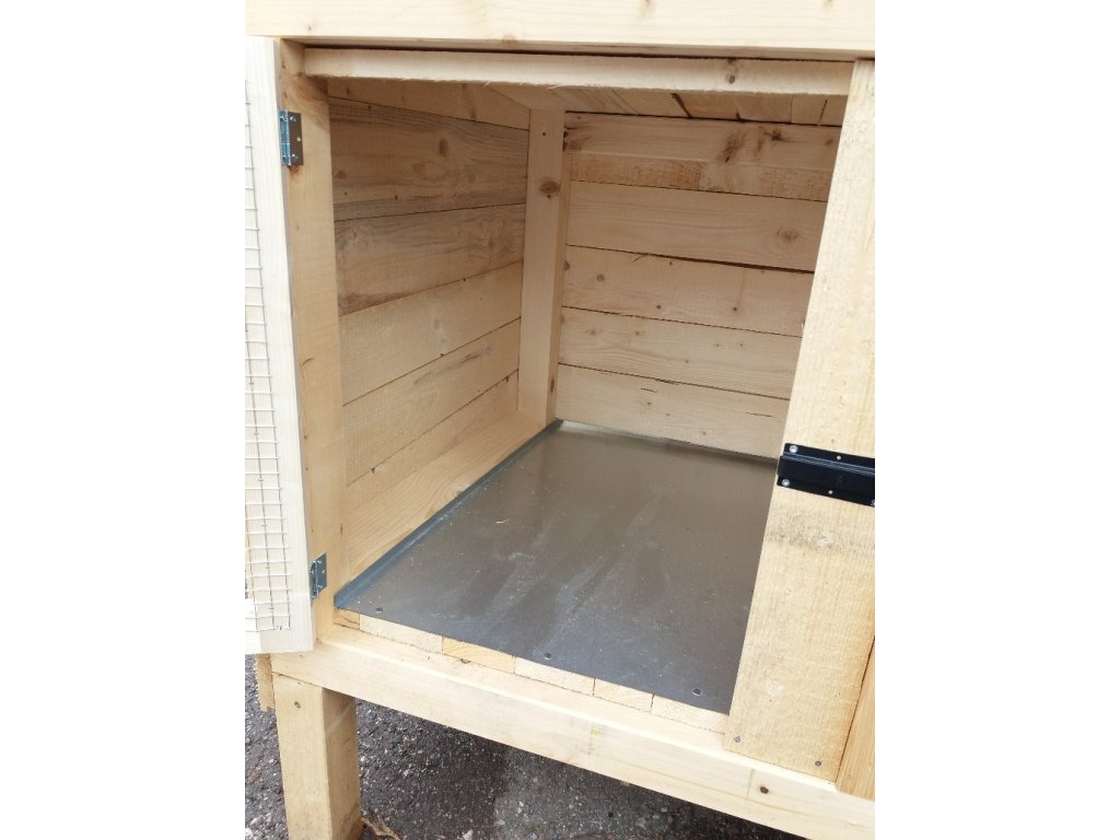 Králíkárna je vyrobena ze silných dřevěných prken spojených pevným zámkovým spojem. Dvířka jsou osazena odolným kovovým zavíráním a králíkářským nebo bodovým pletivem, které zajišťuje bezpečí i dostatek vzduchu. Uvnitř každého kotce je na podlaze kvalitní oplechování a podlahy mají spád dozadu, díky čemuž se snadno udržuje čistota a zvířata zůstávají v suchu.