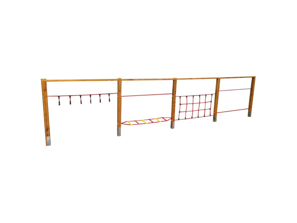 Lanová dráha se čtyřmi díly nabízí dětem zábavnou sestavu lanových překážek, které přirozeně lákají ke šplhání, prolézání a balancování. Jednotlivé části propojené lany a KVH hranoly děti motivují k pohybu a tréninku síly i rovnováhy.