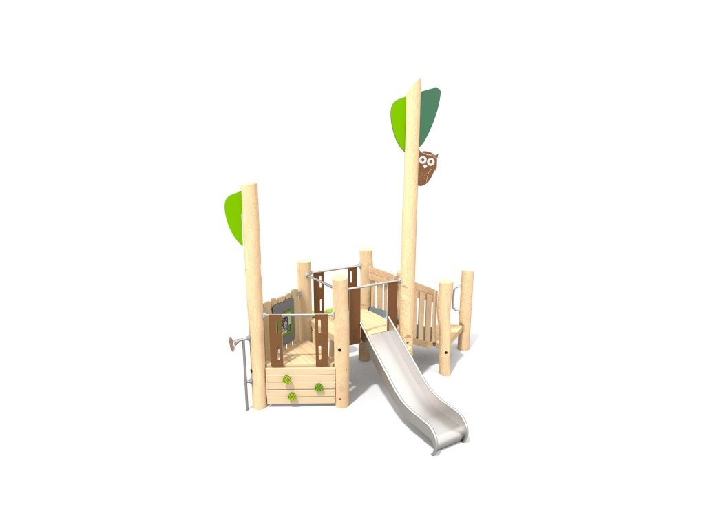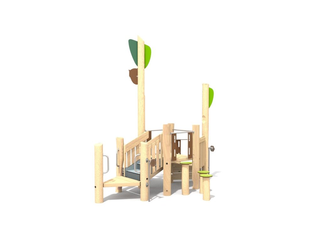 Herní sestava z akátu nabízí kombinaci dvou herních plošin, skluzavky, lezecké stěny a dalších pohybových prvků, které podporují aktivní hru a rozvoj motoriky dětí. Plošiny jsou propojeny schodištěm a doplněny zábradlím pro bezpečný pohyb.