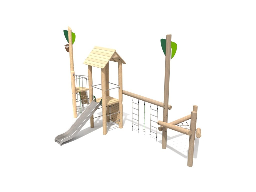 Herní sestava z akátu nabízí kombinaci věže, skluzavky a především lezeckých prvků. Tyto prvky podporují aktivní pohyb dětí, rozvíjejí jejich motoriku a nabízejí zábavu pro různé věkové skupiny.
