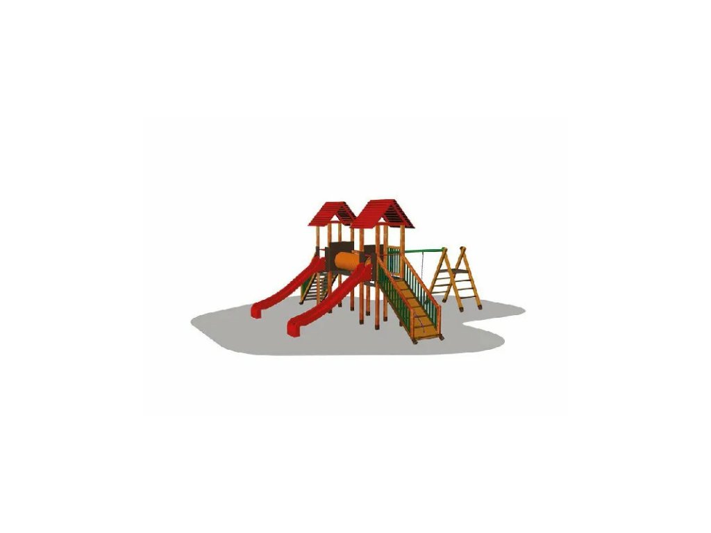Věže se skluzavkami, žebřík, šplhající rampa, prolézací žebřík, řetězová dvouhoupačka a dvouhoupačka baby.