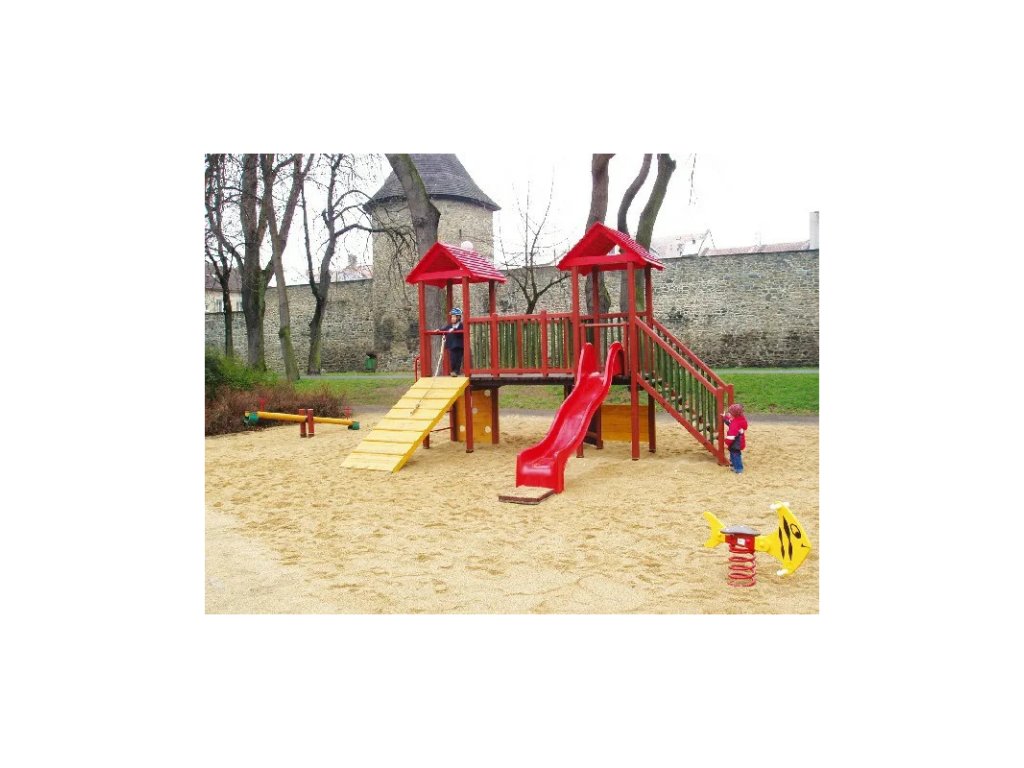 Dvě věže se spojovací lávkou, žebřík, šplhací rampa, skluzavka, kreslící tabule, tyč a schody.
