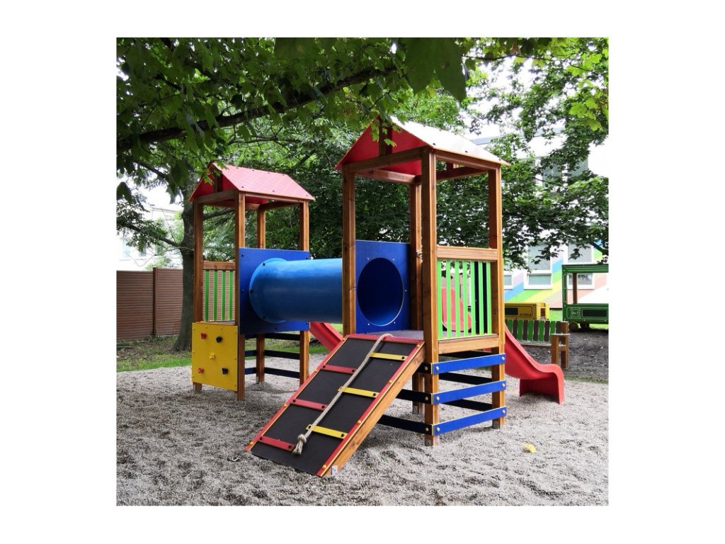 Herní sestava obsahuje: 2 skluzavky, 2 věže s podestou, tunel, šplhací rampa, horolezecká stěna.