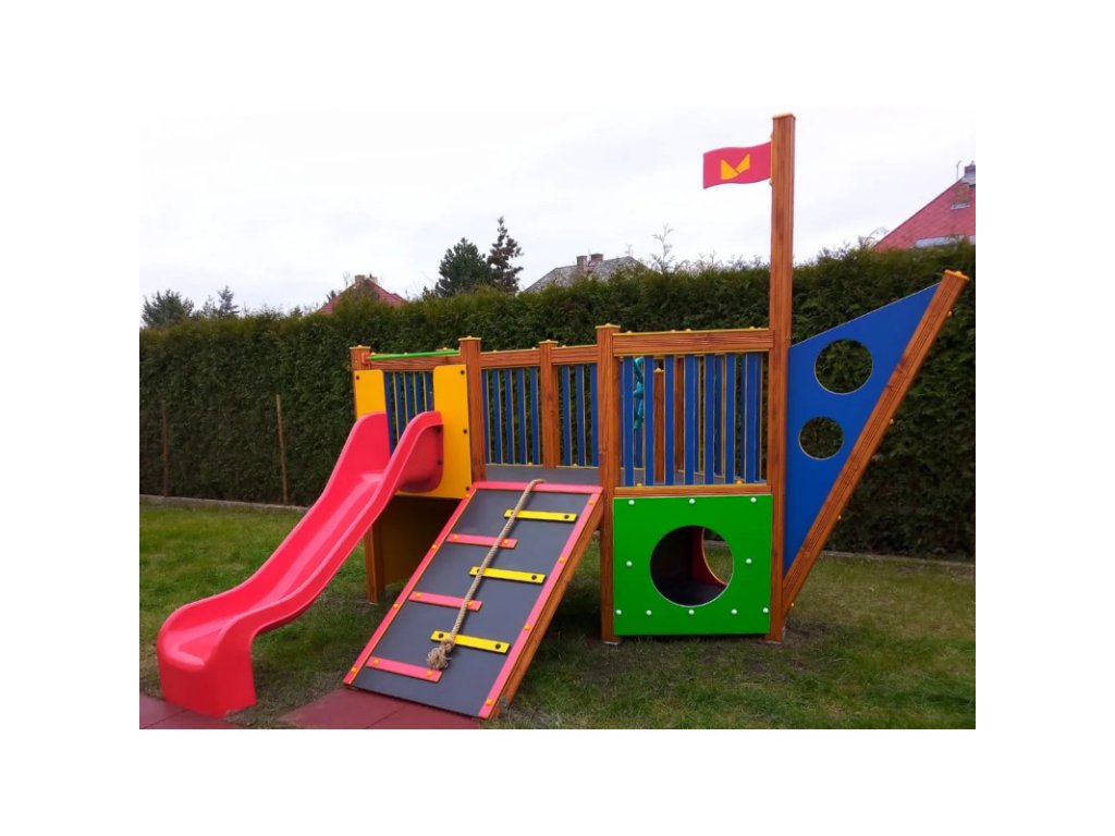 Velká loď se skluzavkou vytváří hravý prostor pro rozvoj představivosti, sociální interakce i sdílené hry na čerstvém vzduchu. Je doplněna o tunel, lezecí rampu, kormidlo a další prvky, které dětem nabídnou dobrodružnou a pestrou zábavu.