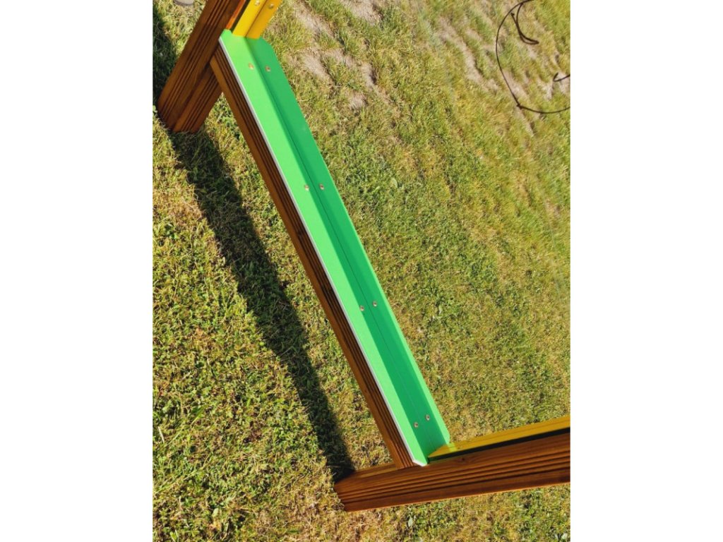 Tabule je vyrobena z KVH hranolů a HDPE desek. HDPE (vysokohustotní polyethylen) je lehký, ale zároveň velmi pevný a odolný materiál, který dobře snáší povětrnostní vlivy, UV záření i nárazy. Díky tomu je tabule vhodná pro venkovní použití na školních zahradách i ve veřejných herních prostorech.