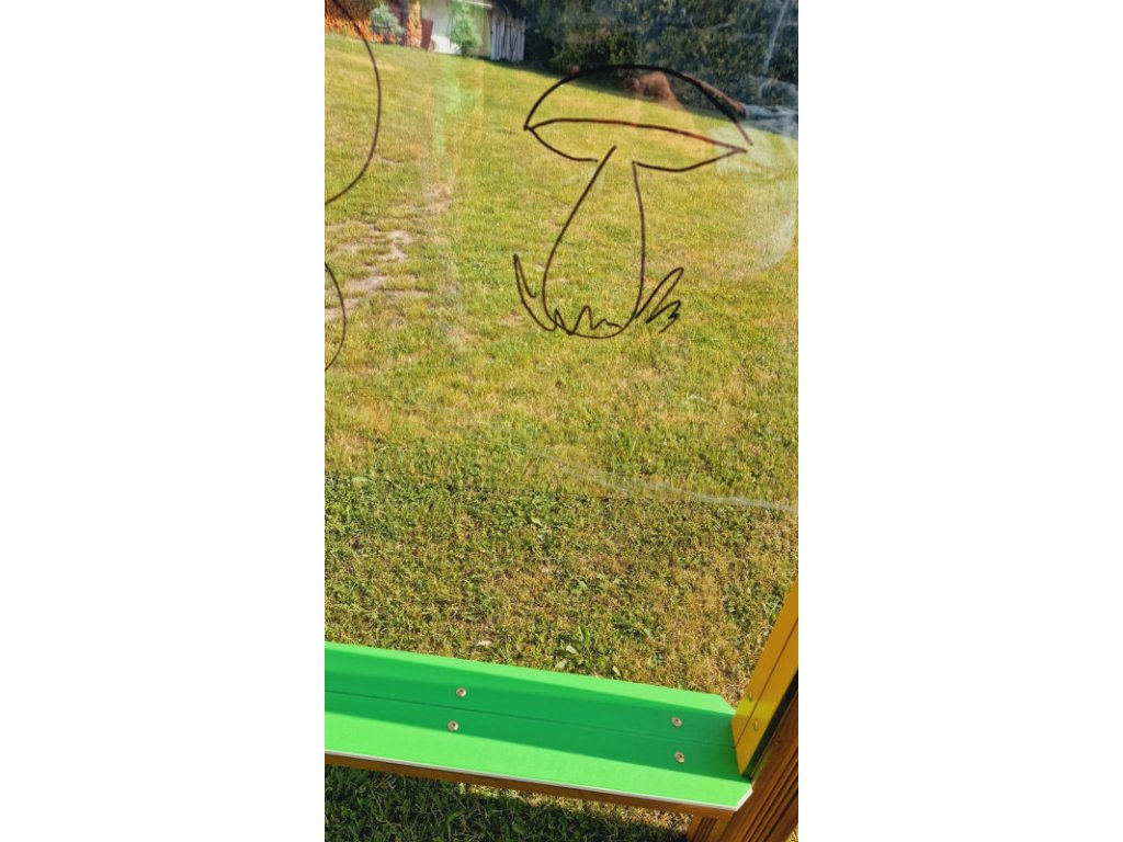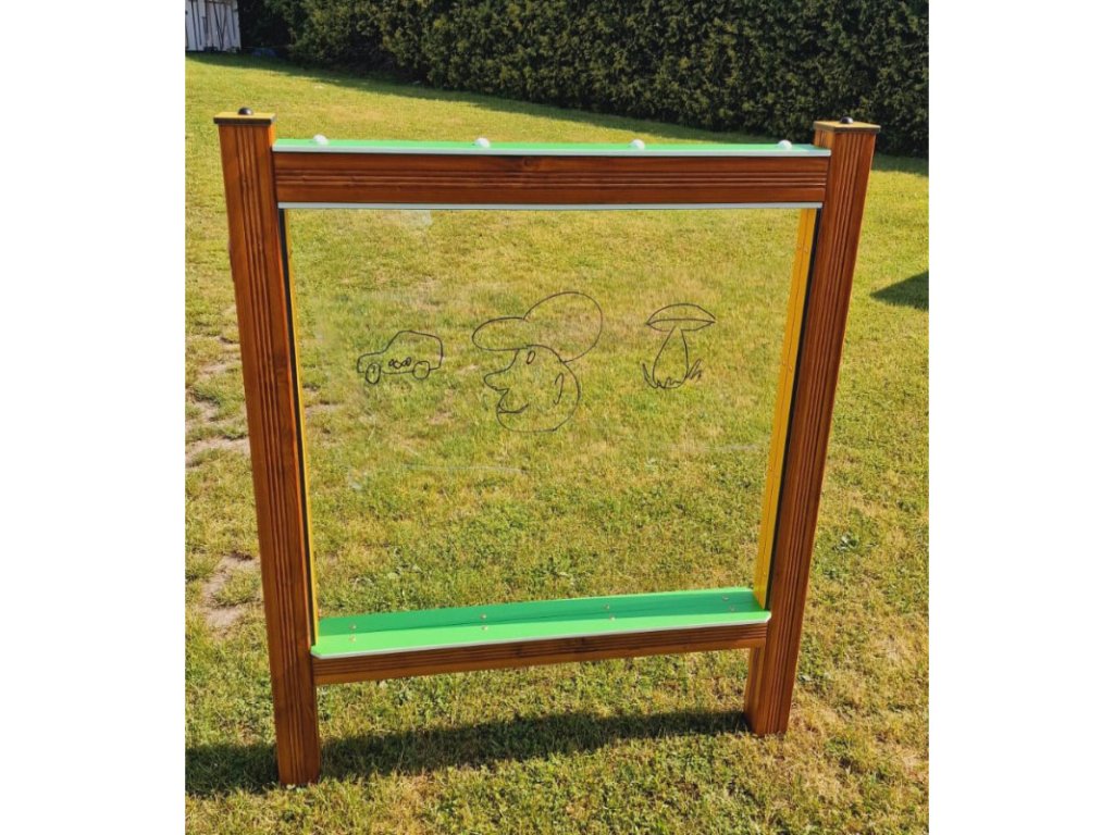 Průhledná tabule na kreslení je originální a netypický herní prvek, který nabízí dětem možnost kreslení a psaní pomocí fixů místo klasické křídy. Podporuje kreativitu a přináší do herního prostoru nový a zajímavý způsob tvoření.