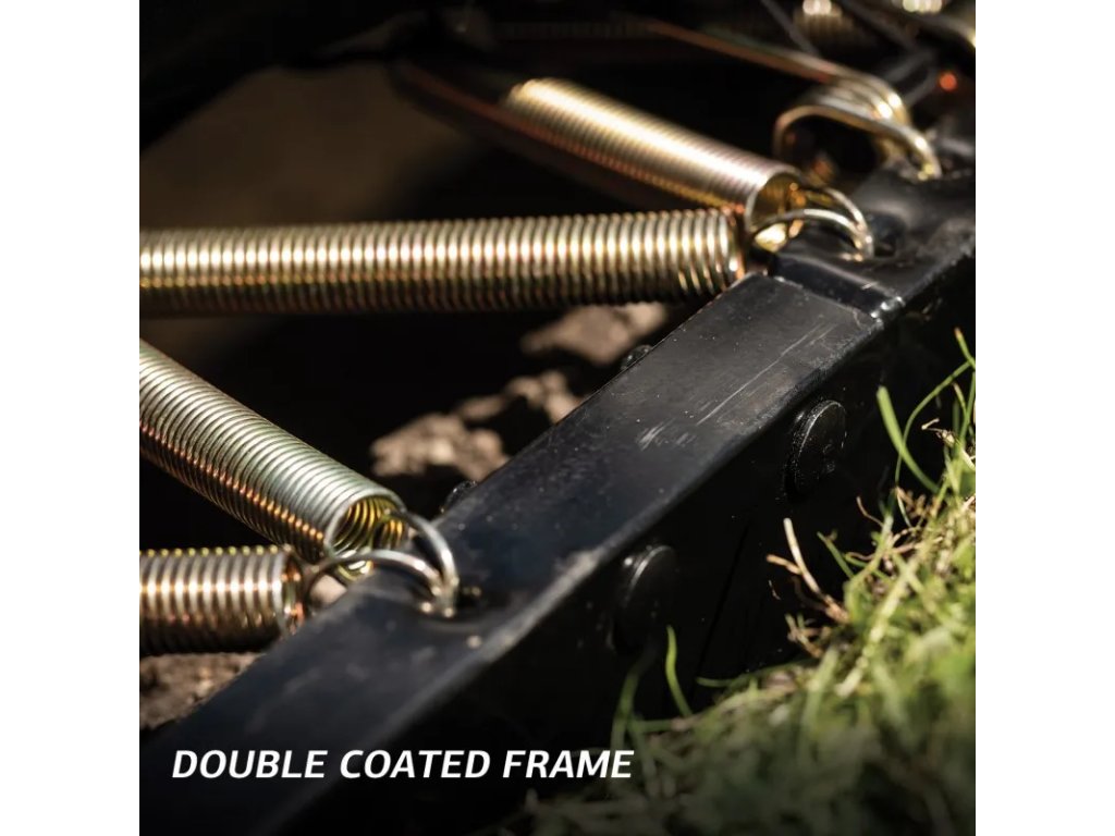 • Kvalita: vysoký počet silných pružin (o 30% pružin více ve srovnání se standardními trampolínami!) se díky novému postupu nasazuje při montáži mnohem snadněji (červené oko pružiny na červenou značku na rámu). Pružiny jsou navíc opatřeny velmi odolným zinkováním, které zajišťuje vynikající antikorozní vlastnosti.