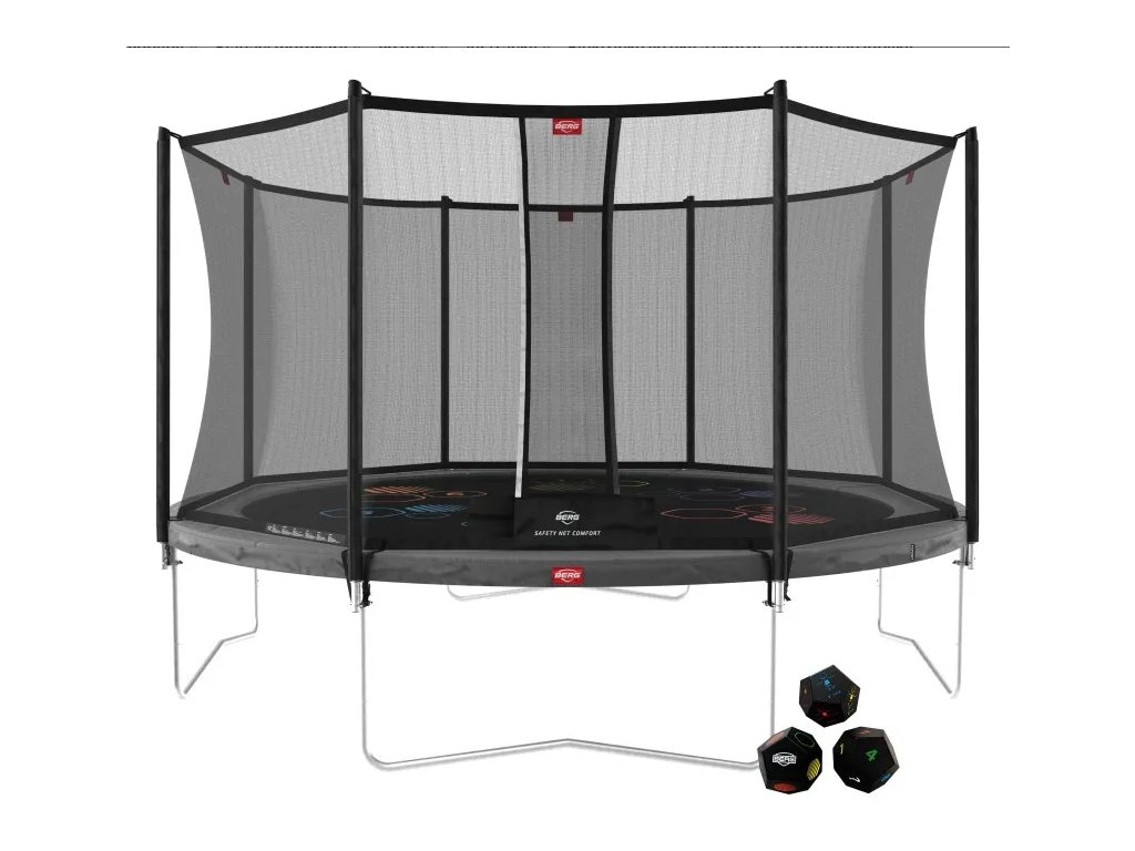 Trampolína BERG Favorit 430 Grey Levels s ochrannou sítí Comfort je navržena pro dlouhé a bezpečné skákání.